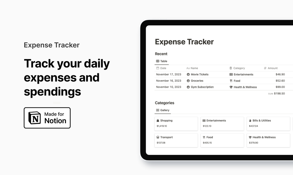 A Notion template to help you track your expenses. By using this template, you can gain a better understanding of how you're spending your money and identify any unnecessary expenses that you can cut out to improve your financial life.