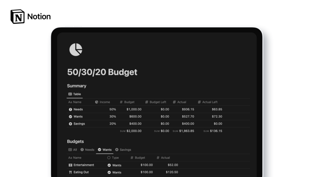 This easy-to-use Notion template helps you plan your money each month using the 50/30/20 budget rule. It helps you spend less on things you don't need and save more for your future.